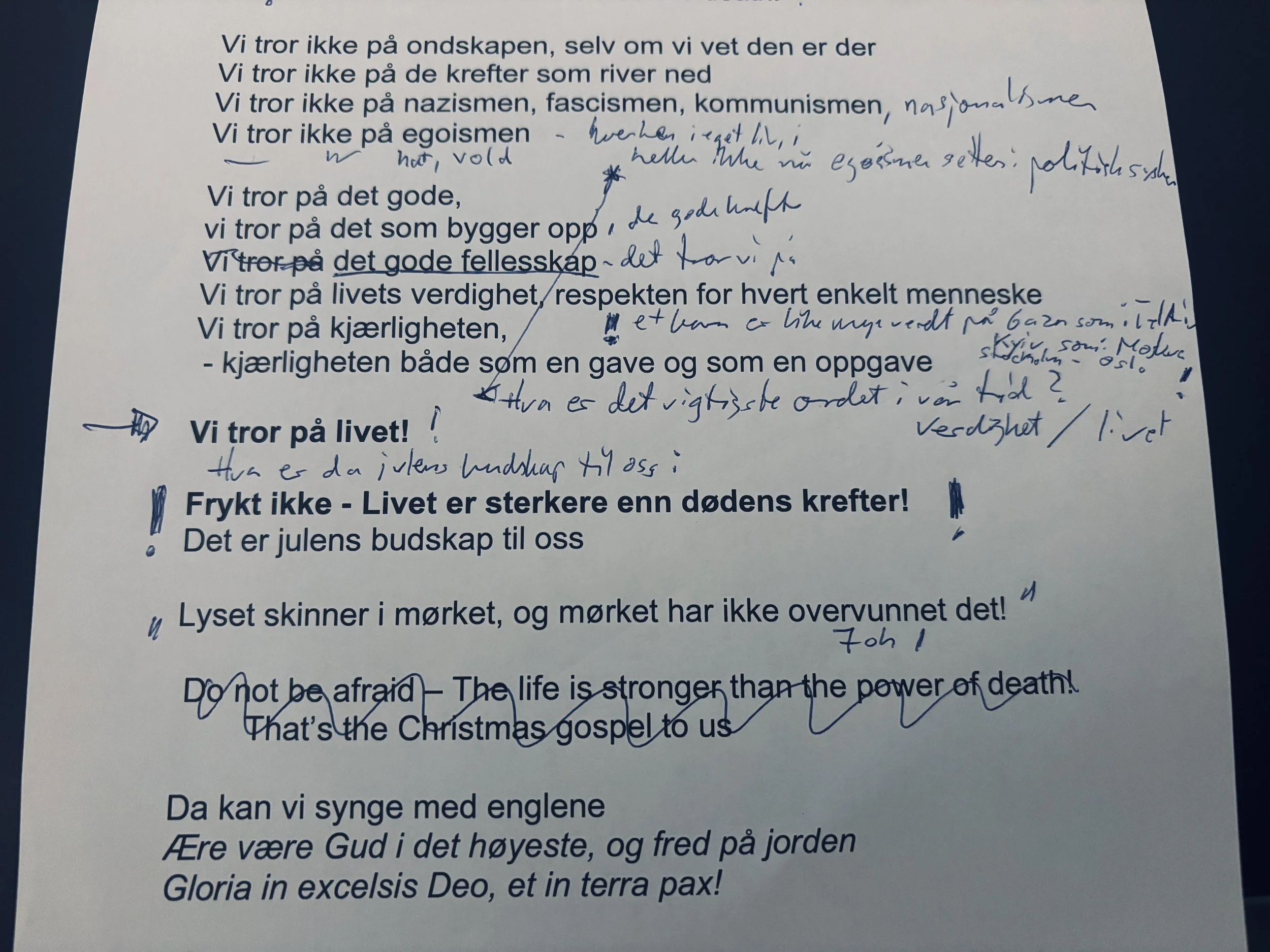 De ordene siterte jeg i Kyiv da jeg var på besøk der i desember. De ordene skal jeg ta med meg også videre på min reise. Vi tror på noe som er sterkere enn dødens krefter. Vi tror på livet, og vi tror på livets skaper!