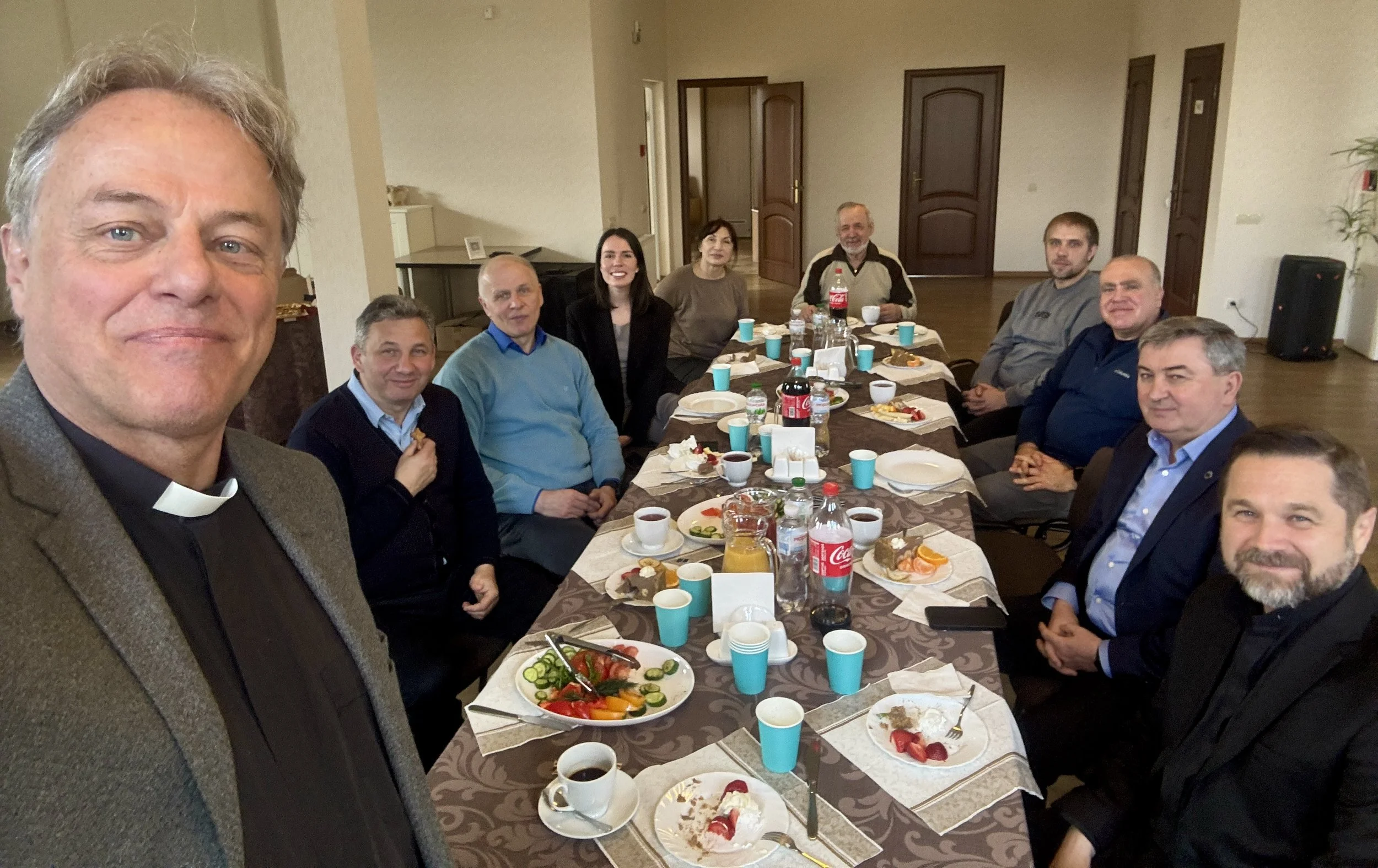 Vel framme i Kyiv besøkte jeg Det Ukrainske Bibelselskapet med dens nestleder og prest Anatoliy Raychynets. Han snakker godt norsk etter å ha bodd noen år i Norge.  På kontoret ble jeg invitert med på feiringen av en av de ansatte som nettopp hadde fylt år. Det ble både pizza, hjemmelagde kaker og den gode prat. Mens vi koste oss i det gode fellesskap, gikk flyalarmen. De så på sine mobiler og ble sittende uten å gå i dekning. Dermed slappet også jeg av selv om vi var tett ved. Droneangrepet var mot et annet område av storbyen, men vi hørte både luftvernet og eksplosjoner av droner som eksploderte en kilometer bortenfor der vi satt.