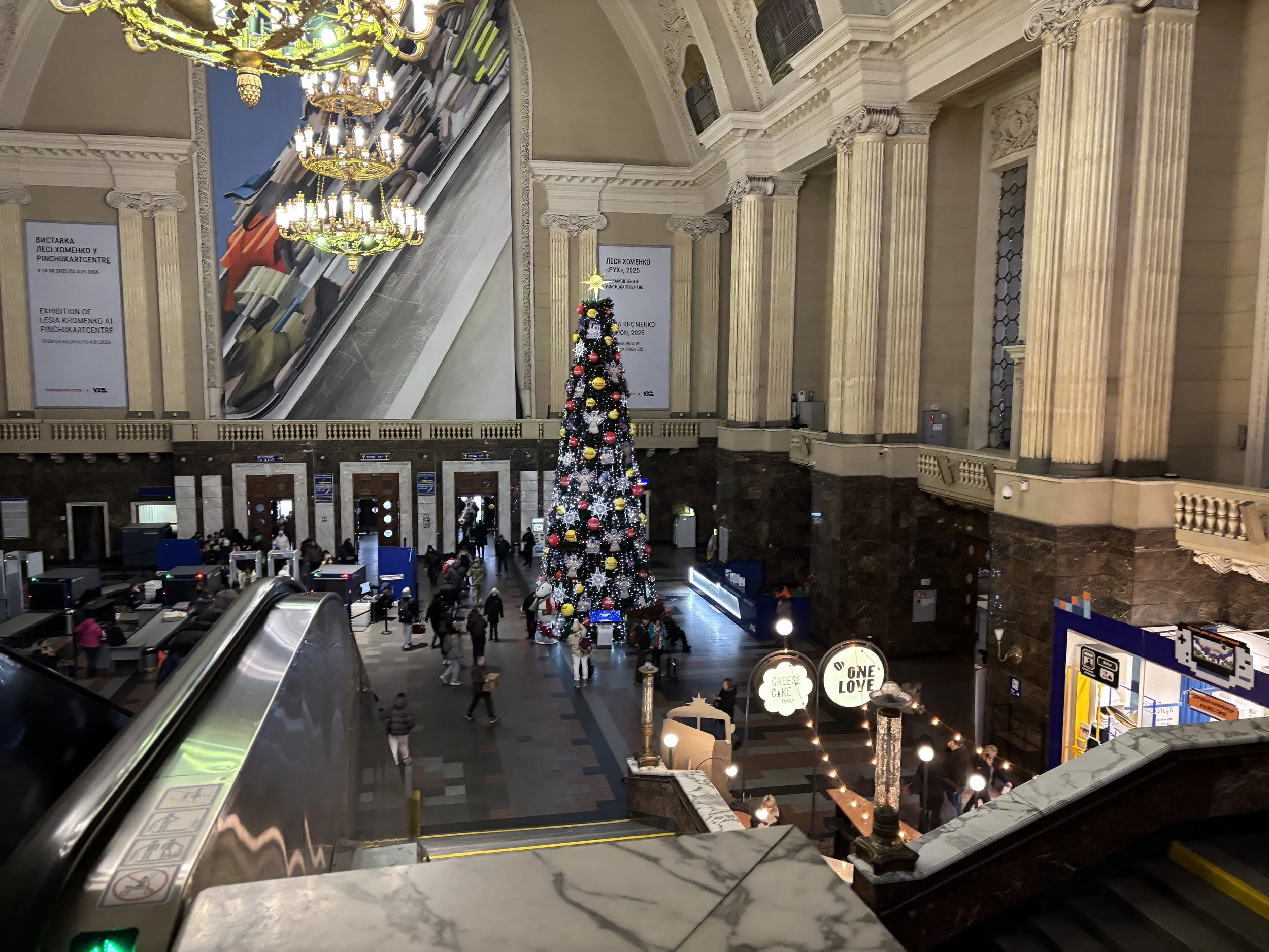 Fint å se at de har pyntet til jul i den store hallen på Sentralbanestasjonen i Kyiv