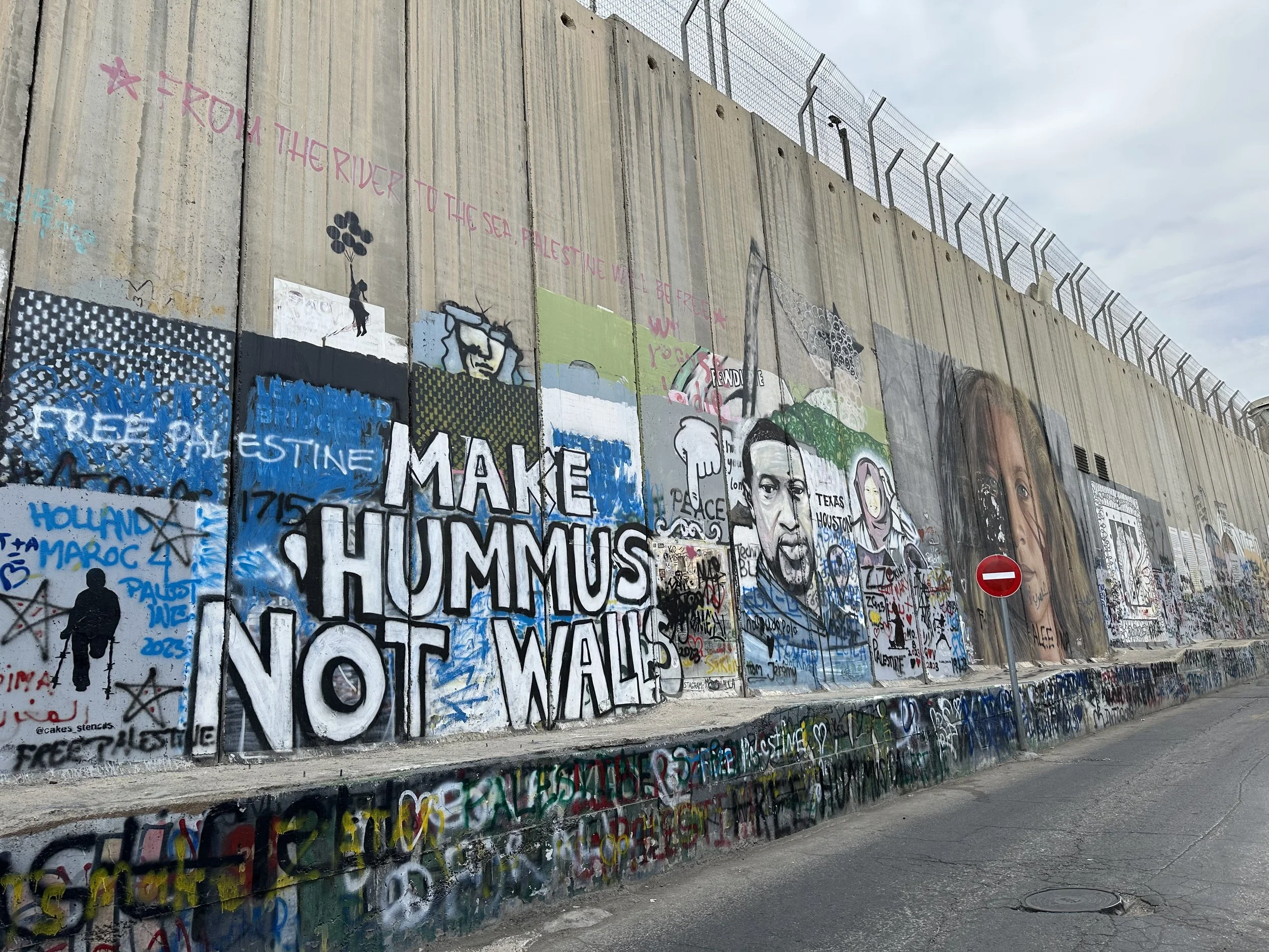 Det er kun en mil mellom Jerusalem og Betlehem. Jeg tar en buss som fører meg til muren og en kontrollpost. Muren er dobbelt så høy som Berlin muren engang var. Da folket rev Berlin muren i 1989, trodde mange at jorden hadde oppnådd fred for all fremtid. I stedet ble ideen spredt videre til Israel noen år senere. Heldigvis er ikke muren bare grå, men rommer graffitikunst som ofte har et budskap; Make hummus, not walls!